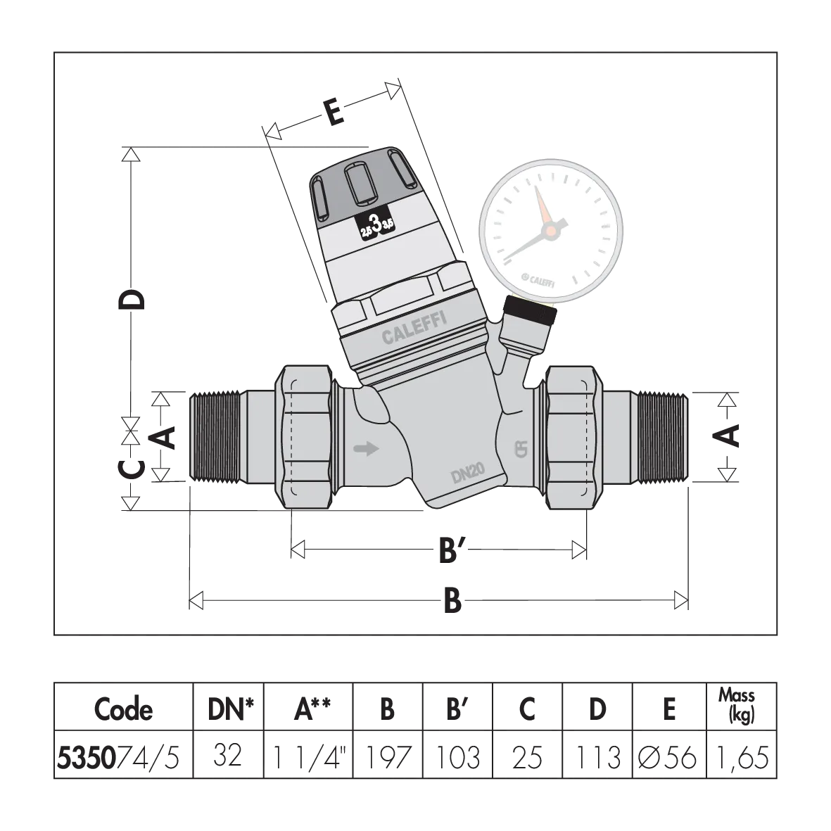 Dahili değiştirilebilir kartuşu bulunan basınç düşürücü vana. Bağlantılar: R 1" (EN 10226-1) E, bağlantı elemanı. Maksimum giriş basıncı: 25 bar. Ortam sıcaklığı: 2–40 °C. Ayar basınç aralığı: 1–6 bar. Materyal: çinkosuzlaşmaya dirençli pirinç DR.